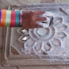 The next step is to embed the mirrors and sequins in the motifs and patterns drawn. The mirrors used for the decoration are called Mirror. They come in myriad shapes including round, diamond, and triangular.